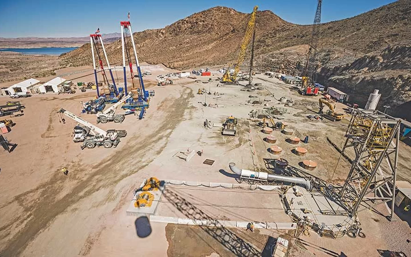 Situated between fault lines, this project required thirty-four 72â in diameter well shafts for submersible pumps. Drilled adjacent to the lake at depths of 500 ft., these shafts will connect into a 12,500 sq. ft. excavated forebay at the base of the shaft. Mandating an extremely precise blind bore drilling method, and the chosen engineering firm could provide highly specialized, precision-engineered tools, equipment, and solutions.